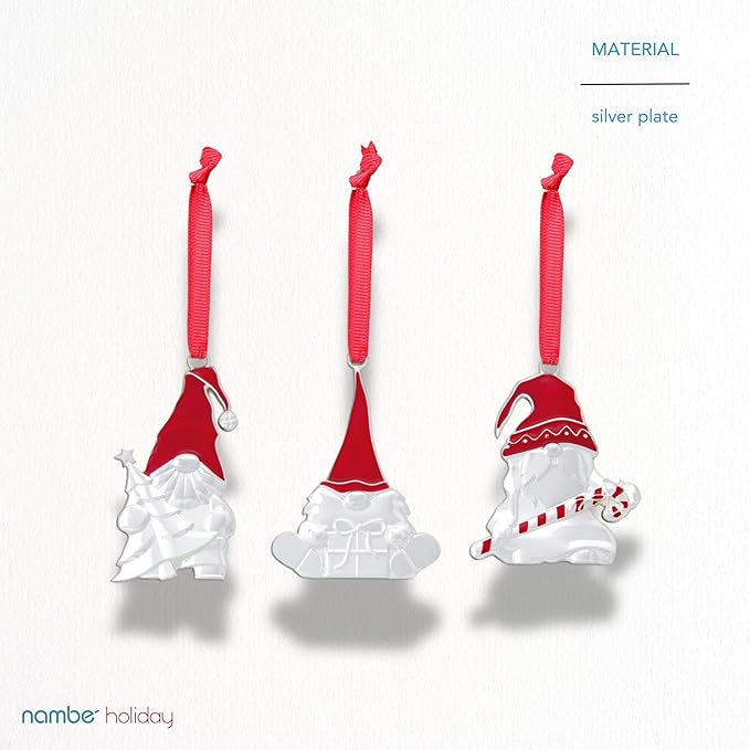 Nambe Whimsical Holiday Mini Gnome Ornament Set – 3 Silver-Plated Hanging Gnome Decorations for Christmas Tree, Seasonal Collectible Ornaments, 3" Each, Silver Plate