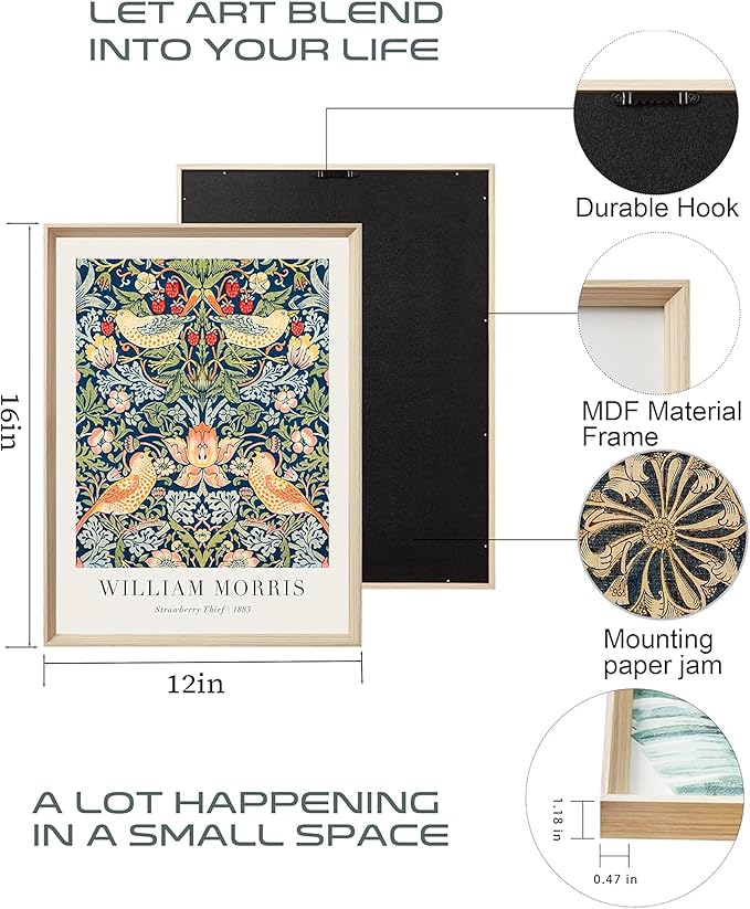 - Framed Vintage Design: Authentic William Morris Wood Canvas Wall Decor featuring intricate designs.