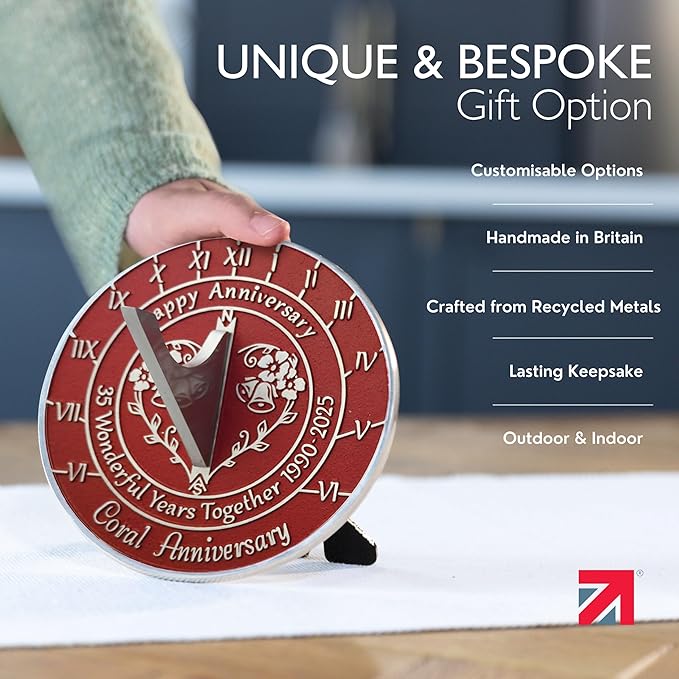 - HANDMADE IN THE UK - With high quality thick aluminum, our craftsmen combine simplicity, elegance and durability into every single sundial. And for this 35th wedding anniversary version, they finished it in red. Some may say it’s a bold choice, we say a well-deserved choice. After all, 35 years is something to shout about.