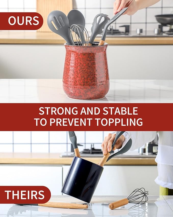 - Sturdy and Secure Design: The robust ceramic base of this utensil crock ensures stability and a firm grip. Its sturdy construction prevents slipping, sliding, or shaking, providing a dependable storage solution even when the holder is rotated