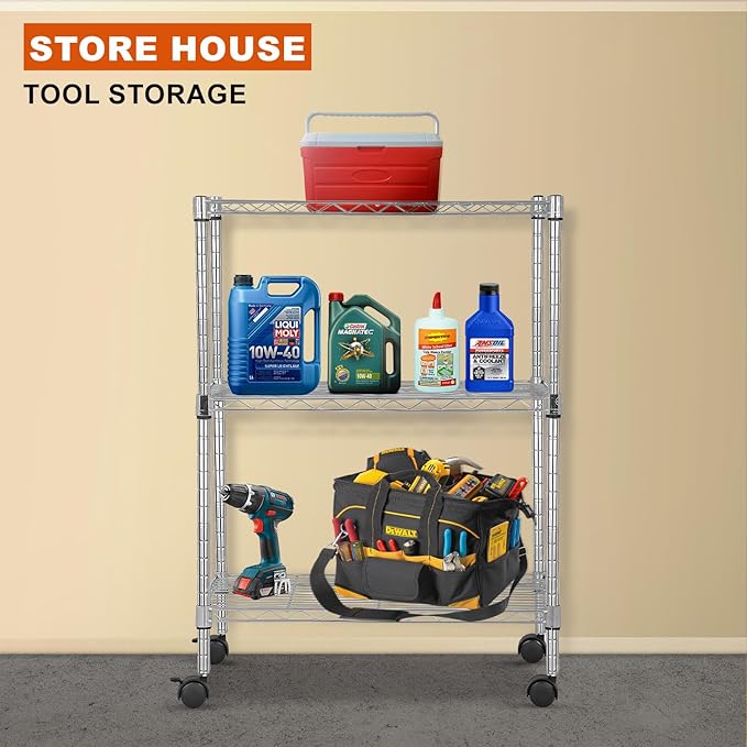 PayLessHere | 3-Tier Wire Shelf with Wheels | 23"x13"x31" | Chrome | Adjustable Racks | Heavy-Duty Storage Shelves, Holds Upto 170 lbs | Rust-Resistant, No-Tool Assembly | for Home, Garage Shelving