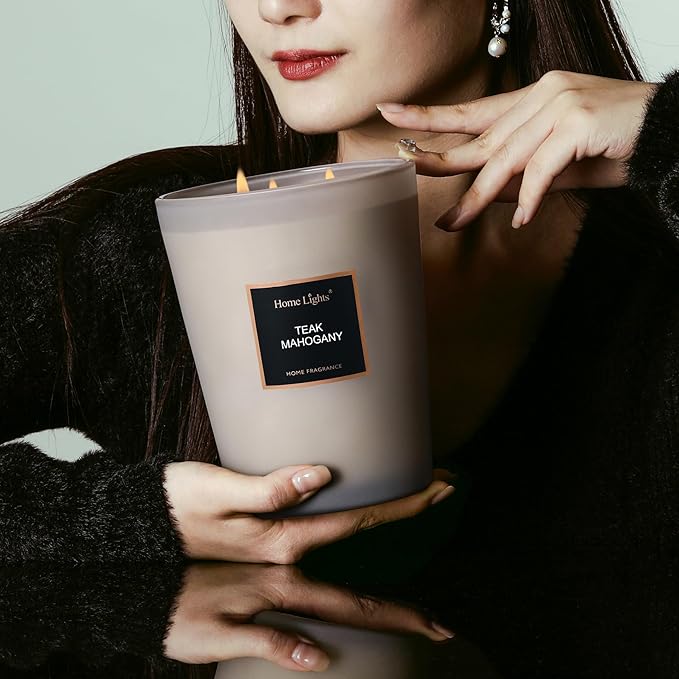 HomeLights Premium Scented Candles - 33.3 oz Natural Soy Wax, Aromatherapy for Home, Long Lasting Smokeless, 130 hrs Burn Time, 3 Cotton Wicks, Gifts for Women & Men - Teak Mahogany