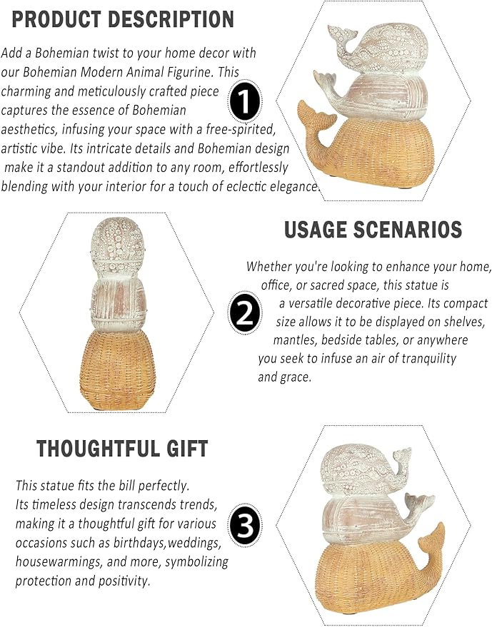 - 【Product Description】Add a Bohemian twist to your home decor with our Bohemian Modern Animal Figurine. This charming and meticulously crafted piece captures the essence of Bohemian aesthetics, infusing your space with a free-spirited, artistic vibe. Its intricate details and Bohemian design make it a standout addition to any room, effortlessly blending with your interior for a touch of eclectic elegance.