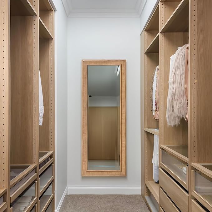 Rattan Full Length Mirror 27"x67" Long Mirror Wood Framed Large Hanging Wall Mounted Mirror Full Body Mirror Decorative Rectangle Floor Mirror Leaning Against Wall for Bedroom Living Room