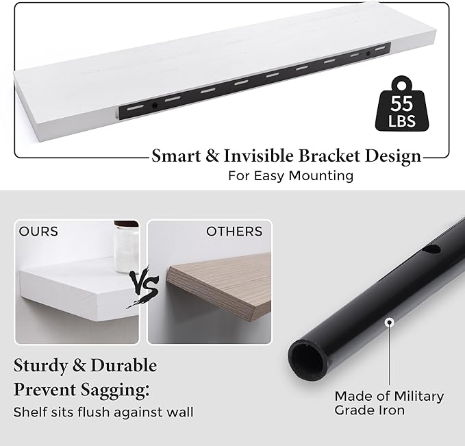 - Sturdy Support: Our high quality Solid Paulownia Wood construction ensures each shelf can hold up to 55 lbs, ensuring your items never sag or fall. Plus, the concealed mounting hardware gives the appearance of floating shelves.