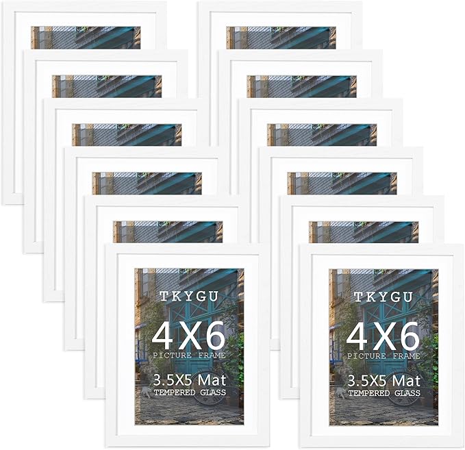 - Cover material: White wood grain tempered glass frame white cushion made of high quality MDF board. The paint is very even, the wood is well textured, and a set of 12 4x6 picture frames, Use as 3.5x5 Frame with Mat or 4x6 Frame Without Mat, is the best choice for wall or Tabletop home decor.