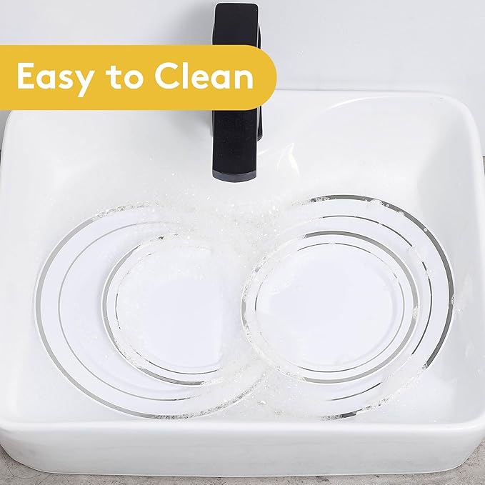 - ELEGANT DESIGN - These disposable plates with a silver rim around the edge, these disposable dinner plates exude sophistication and elegance, reminiscent of luxurious china dinnerware. And instantly elevate any dinnerware setting, and will impress guests at any party or event.
