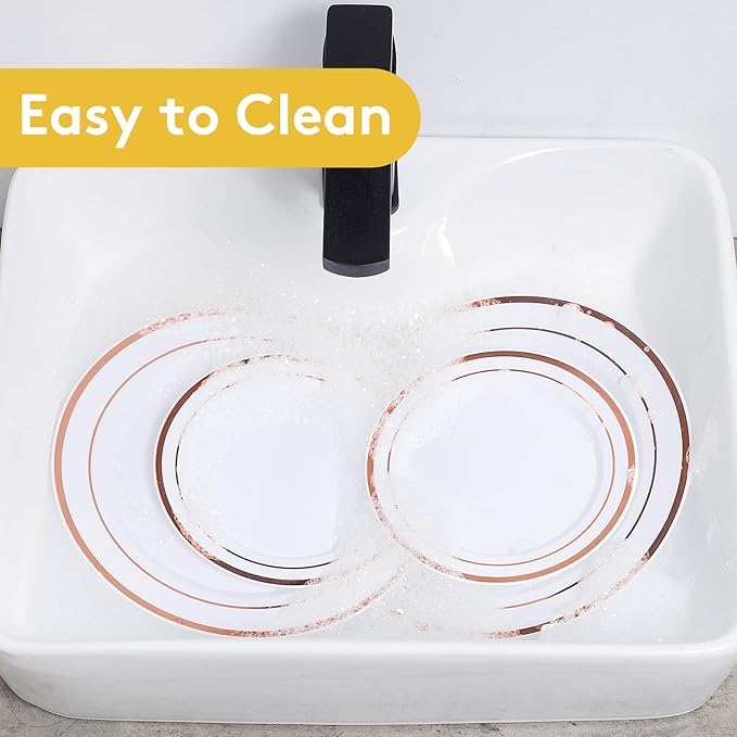 - ELEGANT DESIGN - These disposable plates with a rose gold rim around the edge, these disposable dinner plates exude sophistication and elegance, reminiscent of luxurious china dinnerware. And instantly elevate any dinnerware setting, and will impress guests at any party or event.