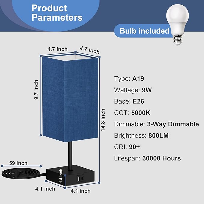 - 3-Way Dimmable Touch Table Lamp: Still worried about not being able to turn on the lights in complete darkness? You will love the sensitive touch feature that makes it easy to turn on and adjust the lamp's brightness to three different levels with a simple tap. Additionally, the navy blue bedside table lamp also boasts a memory function, allowing it to remember your last light settings.