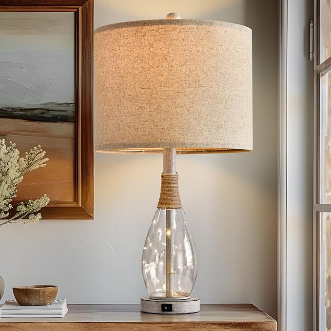 - For Your Loved One: Unique glass table lamps, linen fabric lampshades and high-quality resin wood lamp holders add a romantic and warm atmosphere to your living room, rattan wrapped design on the modern table lamp holder and the glass lamp body of the drip-shaped built-in nightlight make the lamp even more unique.