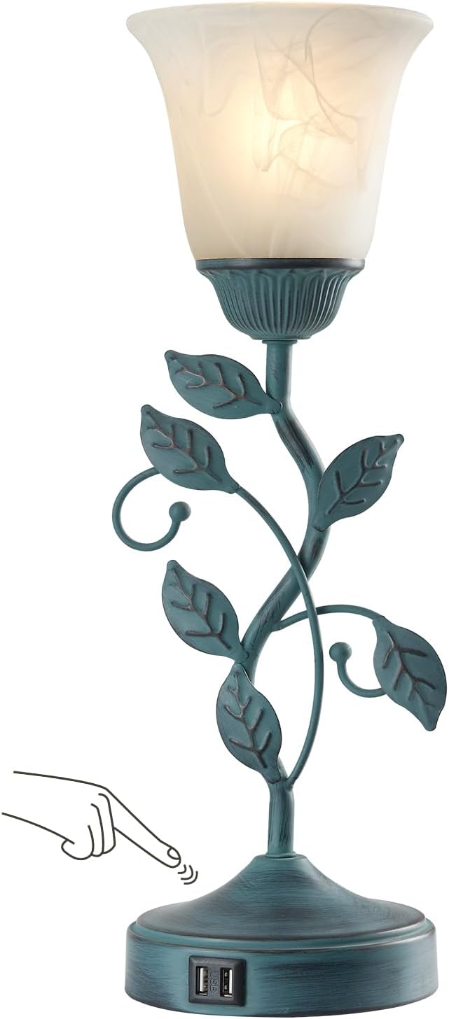 RORIANO Vintage Touch Table Lamp for Living Room, 3-Way Dimmable Nightstand Lamp with 2 USB Ports, Farmhouse Rustic White Glass Shade Leaf Desk Lamp for Bedroom End Table, LED Bulb Included