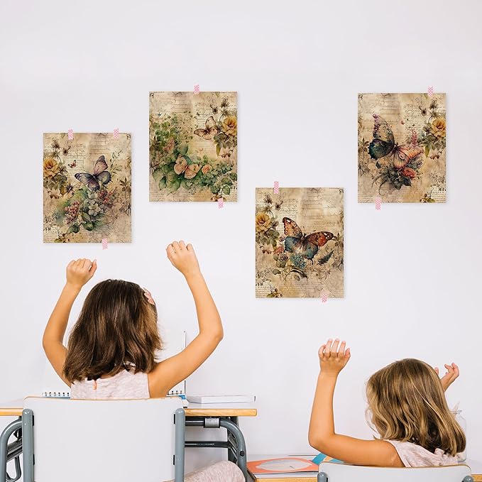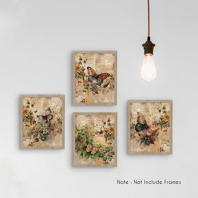 HRQKO Vintage Retro Butterfly Flower Wall Art Poster Prints Set of 4, Butterfly Floral Pictures Artwork Printing Posters Wall Decor, Blossom Botanical Prints for Bathroom Living Room 8”x10” Unframed