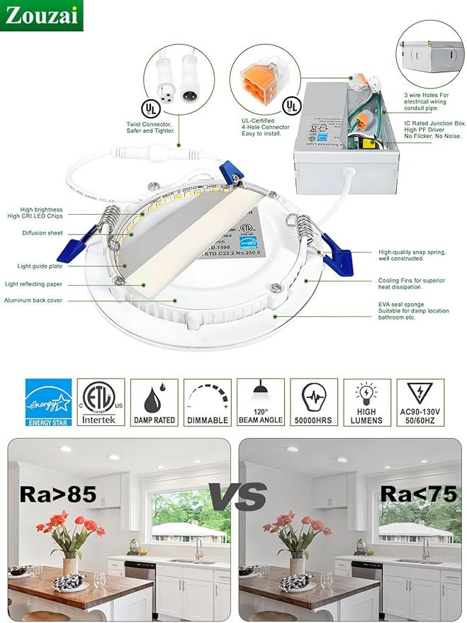 zouzai 20 Pack 6 Inch Ultra-Thin LED Recessed Ceiling Light with Junction Box 5000K Daylight Adjustable Dimmable Can-Killer Downlight - ETL and Energy Star Certified