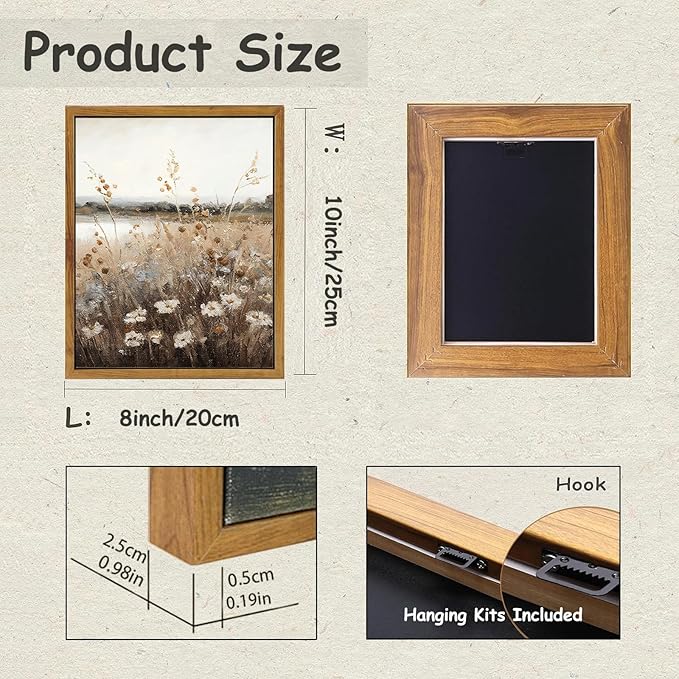 - 【Ready To Hang】Measuring 8x10Inch(20x25cm), this framed canvas art wall decor arrives ready to hang on the wall with hanging kits. (Before nailing the hook onto your wall, please refer to the installation instruction image provided. ) This vintage painting piece will bring a soothing effect to any room of your home with its calming colors. This antique autumn wildflower print is perfect for farmhouse style spaces, with a bold elegance that makes it an iconic centerpiece for you.