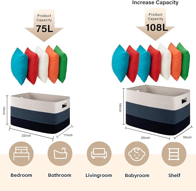 - Decorative Blanket Storage for Living Room:This rectangular blanket basket is more stable and easier to restore its sahpe after you receive the package. The 25’’ x 16’’ x 16’’ large storage basket can also used to store blankets, pillows, cushions, toys, clothes and towels