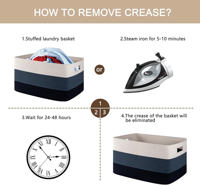 - Washable Large Basket: This large basket can be washed by hand or machine with gentle detergent. If machine washed, please put them into a laundry bag. NOTE: These cotton rope baskets are folded when shipping, but it will turn back to its elegant shape quickly if you fill it with some towels or clothing, and iron is great idea to remove the creases