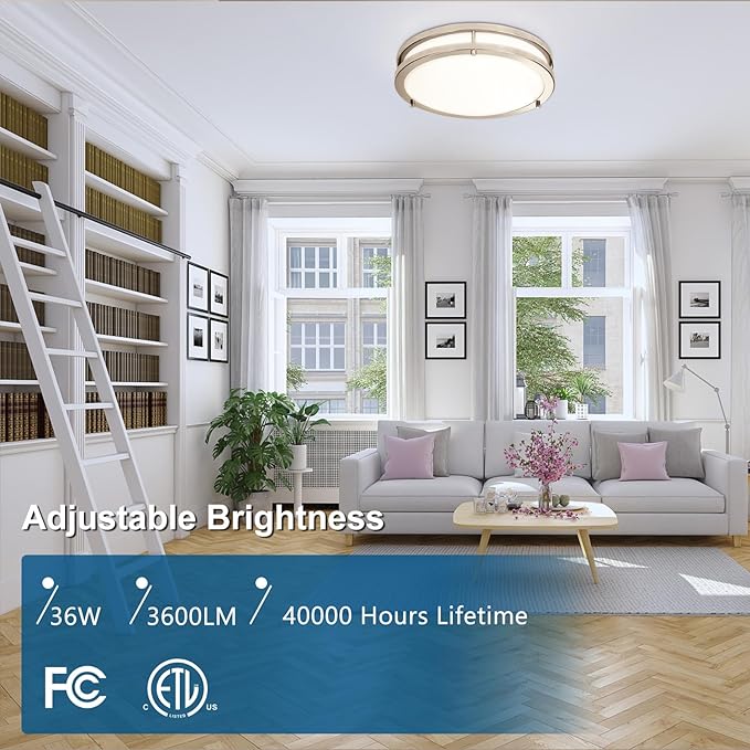 - 【Adjustable Brightness, Energy Saving】The ceiling light fixture can be adjusted according to your needs, dimming the light to create a romantic and soft atmosphere, and turning up the brightness to suit your work needs. This brushed nickel ceiling light has 80 high efficiency leds built in, which work very efficiently producing 3600 lumens of super bright light with a low power consumption of 36W. Replaces 360W old incandescent bulbs, saving 90% energy. Life expectancy over 40,000 hours.