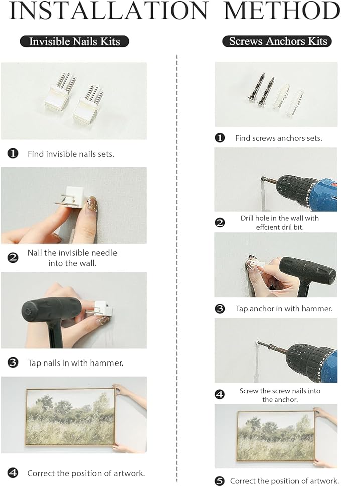 - Ready to Hang: This framed canvas art wall decor is designed for convenience. It comes with two hooks, making it effortless to hang. Before nailing the hook onto your wall, please refer to the installation instruction image provided. (Please note that this item is handmade, so a size error of about 0.2 inches may occur)