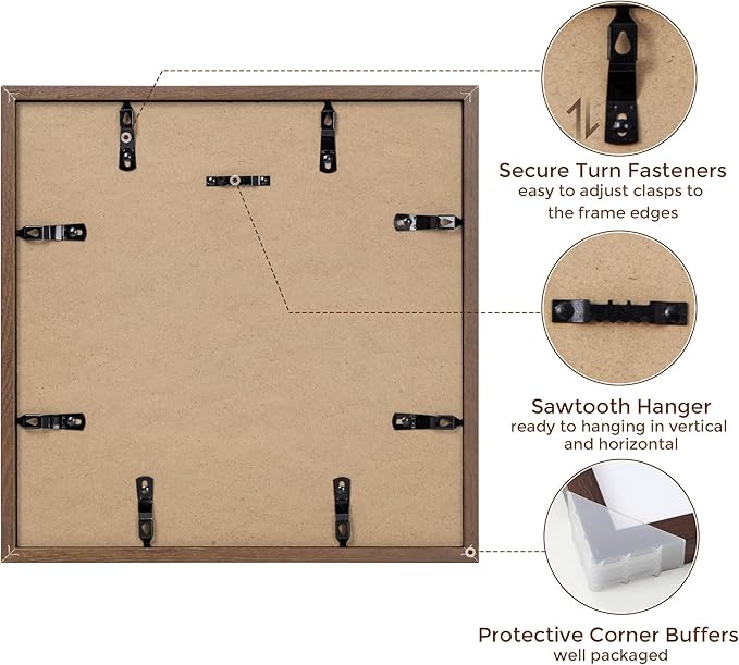- WELL PACKAGED - Each 12"x12" square frame is shrink-wrapped and secured with corner protectors, all of our 12 x 12 wood frames are packaged in custom-made corrugated boxes so your frames arrive in pristine condition.