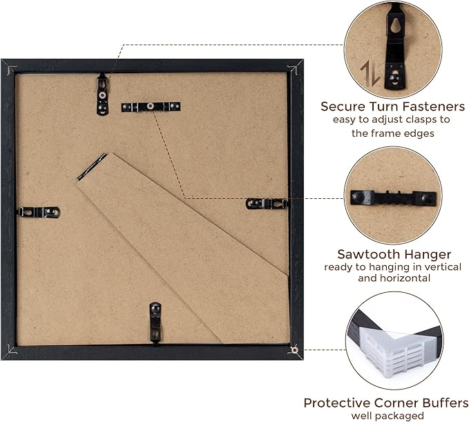 - WELL PACKAGED - Each 8"x8" square frame is shrink-wrapped and secured with corner protectors, all of our 8 x 8 wood frames are packaged in custom-made corrugated boxes so your frames arrive in pristine condition.