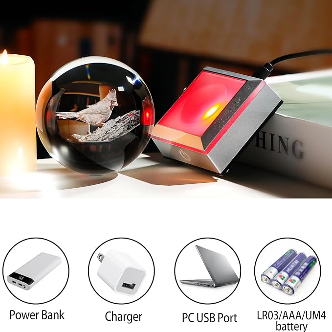 - Colorful Light Base: Each ball is equipped with a silver LED base. The light of the LED base can change color automatically or fixed color, making the pattern clearer and more vivid, you can use it as a night light. The light base has two models of power supply, one is using 3 AAA 1.5V batteries, another one is using a charging cable (the package doesn't include a battery and plug), you can use the cable to connect the computer, car, or portable charger.