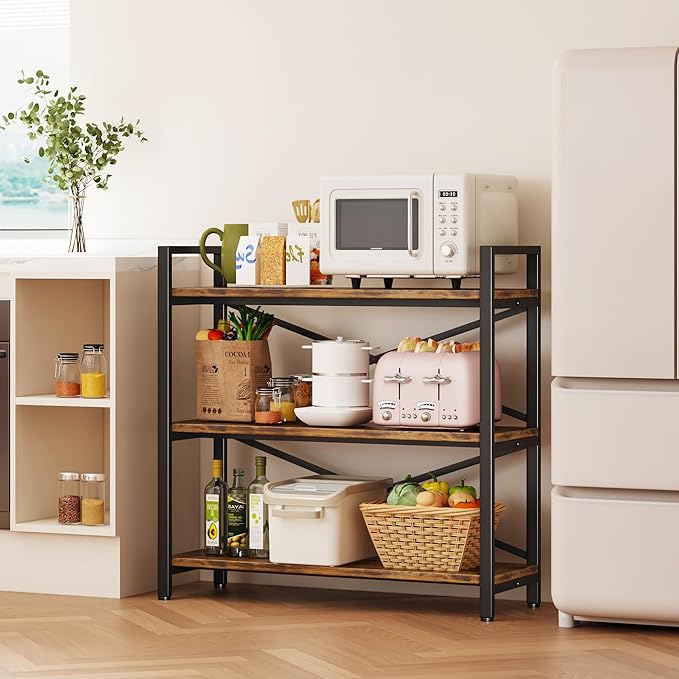 Homeiju 3 Tier Bookshelf 31.49" Width, Wood and Metal Etagere Bookcase, Vintage Farmhouse Modern Wooden Big Book Shelf for Home Living Room Bedroom Office Storage(Rustic Brown)