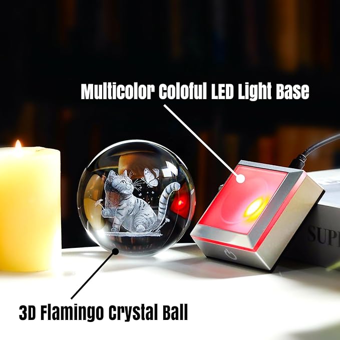 - K9 Crystal Ball: Each ball is made of K9 crystal. The 3D Cat Butterflies crystal ball was engraved inside balls by an advanced etching technology, which is clear, lifelike, and vivid. Matched with a multicolor LED light base.