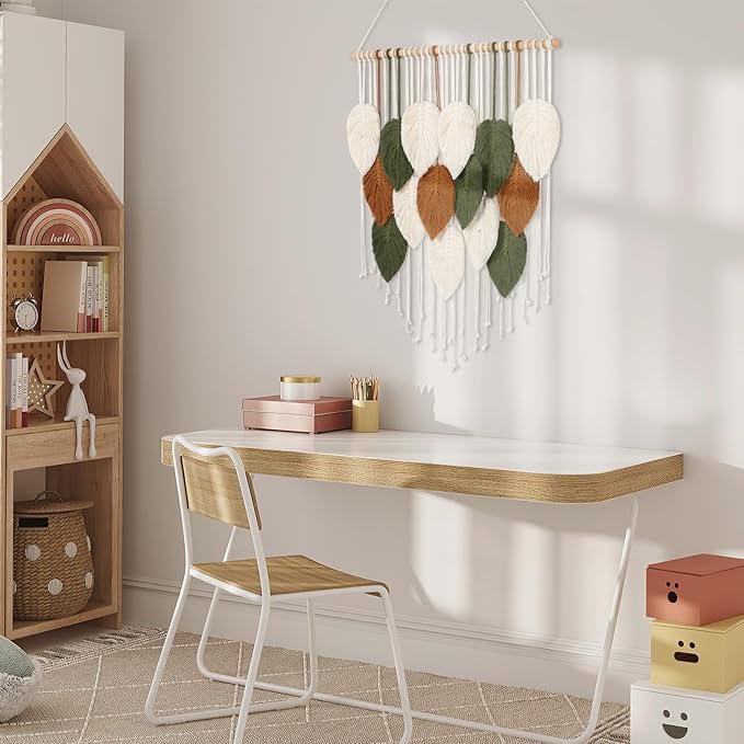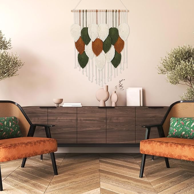 - 【Premium Quality Material】Meticulously macrame leaf and tassel tapestry is made of pure cotton material and high-quality wooden poles. Macrame tapestry is hand-woven, fine workmanship, without artificial ingredients or chemicals, eco-friendly, sturdy and stable. The leaves may be curly during transport, gently comb the tassels and hang it up for a few days and let it spread naturally, you will get a more beautiful wall hanging.