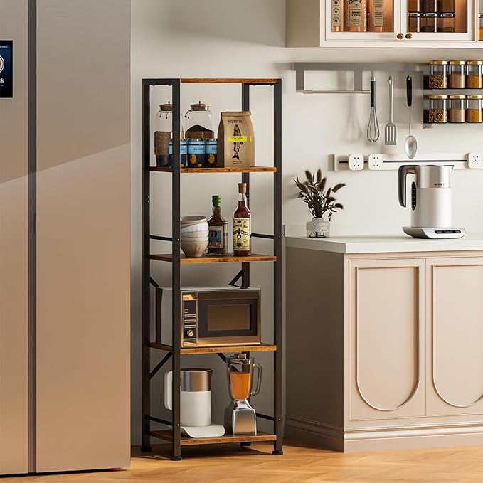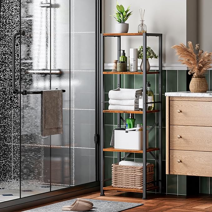 Furologee 5 Tier Tall Bookshelf, Rustic Narrow Bookcase, Display Standing Shelf Units, Metal and Wood Storage Shelves Organizer for Bedroom, Living Room, Home Office, Entryway, Kitchen, Rustic Brown