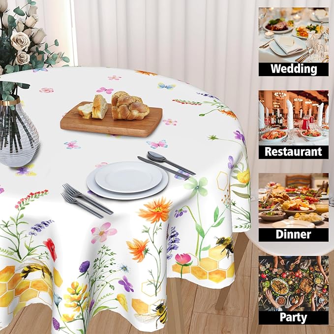 - 【Size & Design】This round tablecloth 60 inch best for table seating 4-6 chairs. This tablecloth suitable size for most restaurants, kitchens and outdoor tables. Spring round tablecloth with colorful and elegant wildflower and bee patterns will create a winning vitality atmosphere for your festive table, feature a casual lightweight drape add too elegant for your table. It is the tablecloth best fit for spring and holiday!