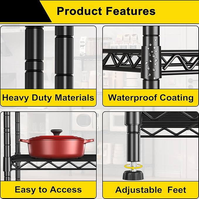 - SUPER-STORAGE RACK: Metal shelves (36.2''L x 14''W x 53.4''H) has strong storage performance, suitable for room, balcony, office, kitchen shelves, closet shelves, pantry shelves, garage storage and laundry room shelves.