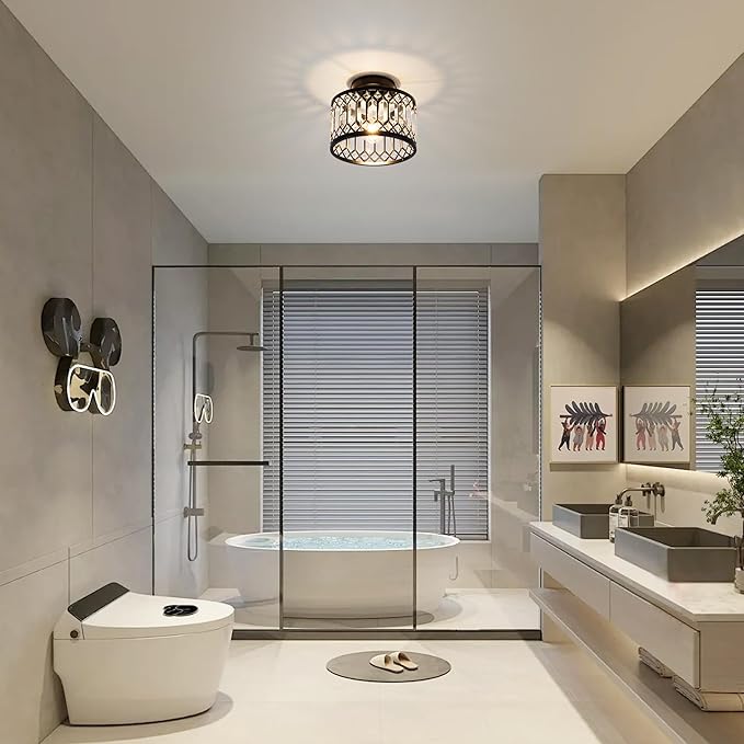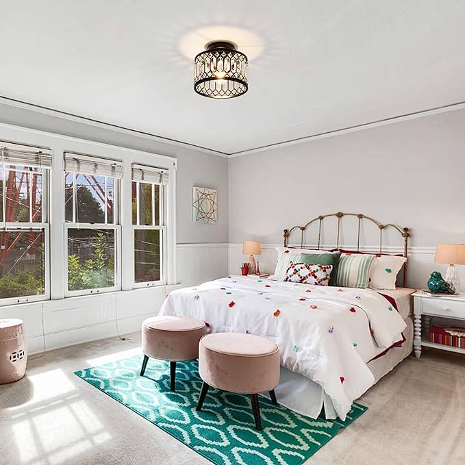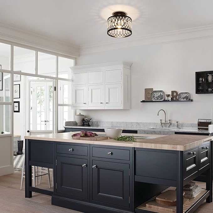 - 【Crystal Flush Mount ceiing light Design】This Modern Flush mount ceiling light features Black frame with crystal shade.The round metal construction and clear crystal decoration make this modern crystal chandelier simple and luxurious yet elegant,while also reflecting the colorful light around the room in a clever way. Creating a comfortable and elegant atmosphere in your home.