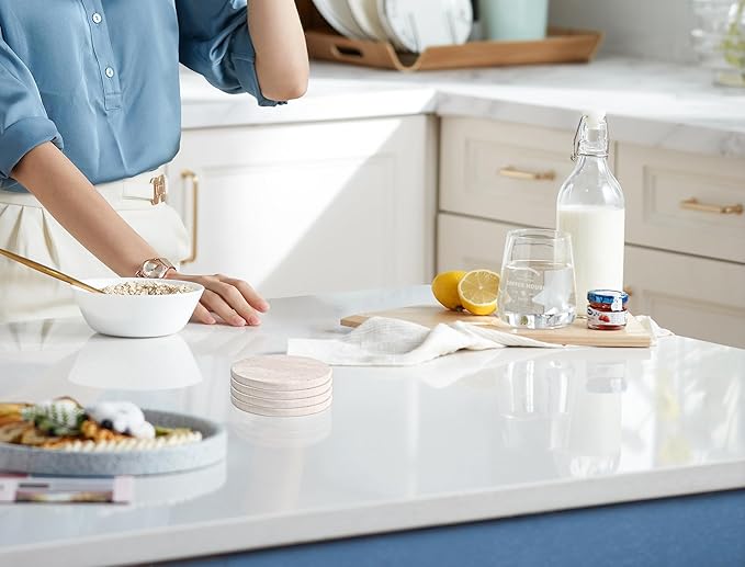 - 4. Give your home a touch of natural elegance with this CHISELED ST DF SK Natural Stone Coaster Set. These coasters, made from porous natural limestone, are designed to absorb any moisture, keeping your furniture free from drink rings. With a diameter of 4 inches and a thickness of 0.47 inches, the set of 4 coasters comes with a non-slip cork backing to ensure they stay in place. Their light beige color makes them a versatile addition to any home decor and a perfect holiday gift.