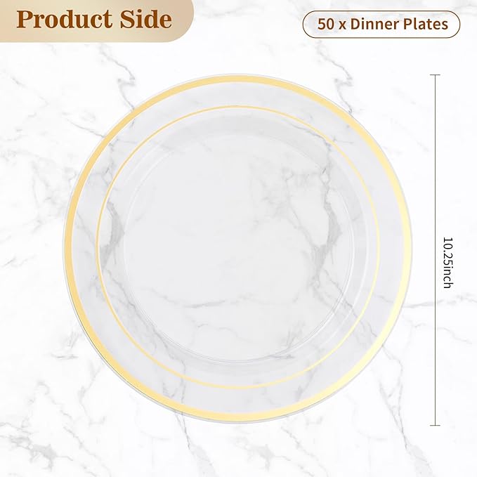 - DIMENSION DECODED - Elevate your dinner delights with our party supplies. Unveil elegance with 50 exquisite dinner plates (10.25''). Thoughtfully chosen for sweet and savory pleasures, these elegant party plates are perfect for presenting delightful cakes and more. Elevate any occasion, showcasing culinary masterpieces with style.