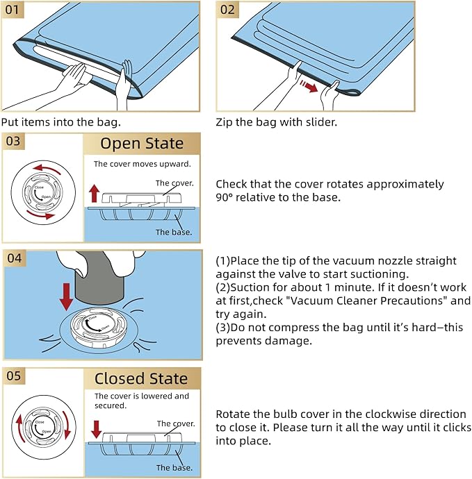 - Easy to Use: Compatible with regular vacuum cleaners, just put, zipper, vacuum and finish. After Exhausting the air, remember to rotate and close the valve, Don't worry about reusability, this bags are waterproof and reusable season after season