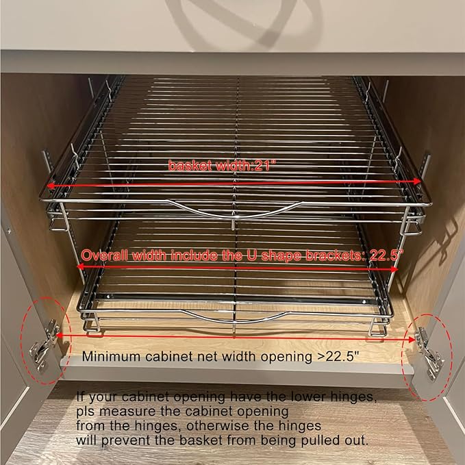 - ๐ใProduct SizeใDINDON 2 tier pull out cabinet organizer --- ๐Overall Size is 22-1/2โ W x 21-1/2"D x 15"H, this size refer to the maximum width Including the U-shape brackets, ๐ Actual The Basket Size is 21"W x 21-1/2" D x2-3/8โH. Fits cabinet with more than 22-1/2โ W clearance between door hinges or larger. Min cabinet interior depth: 23 inch. If your cabinet has hinges, measure the width from the hinges, otherwise the hinges will prevent the basket from being pulled out.