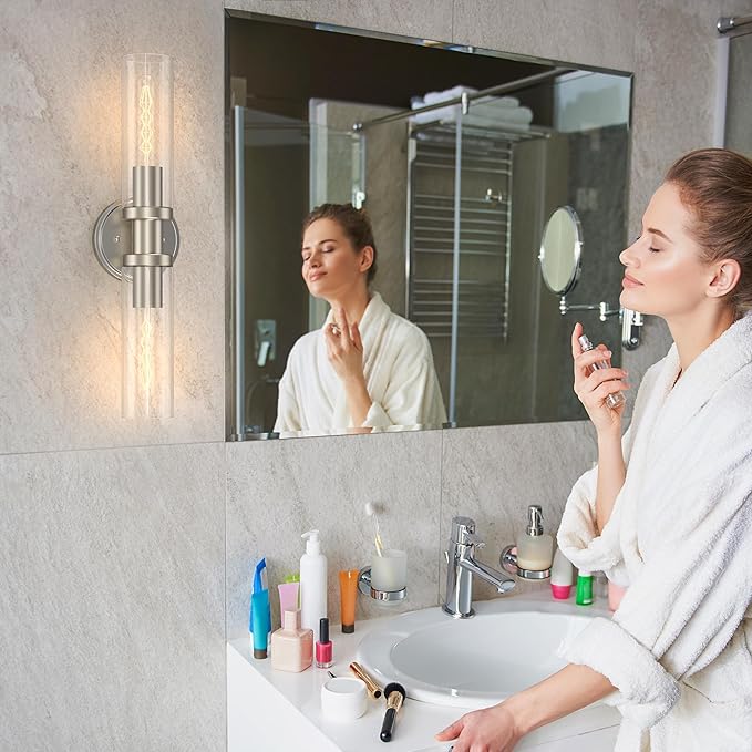 - Upgraded Vanity Light with Linear Glass Shades: The linear brushed nickle bathroom light fixtures 2 lights come with 2 pieces of longer clear glass shades. Compared with other similar items without the shades, Espird 2 light brushed nickle bathroom light is much safer when it is put in bathrooms. Besides, the glass lampshades add more delicacy to your bathroom and it is much easier to clean.