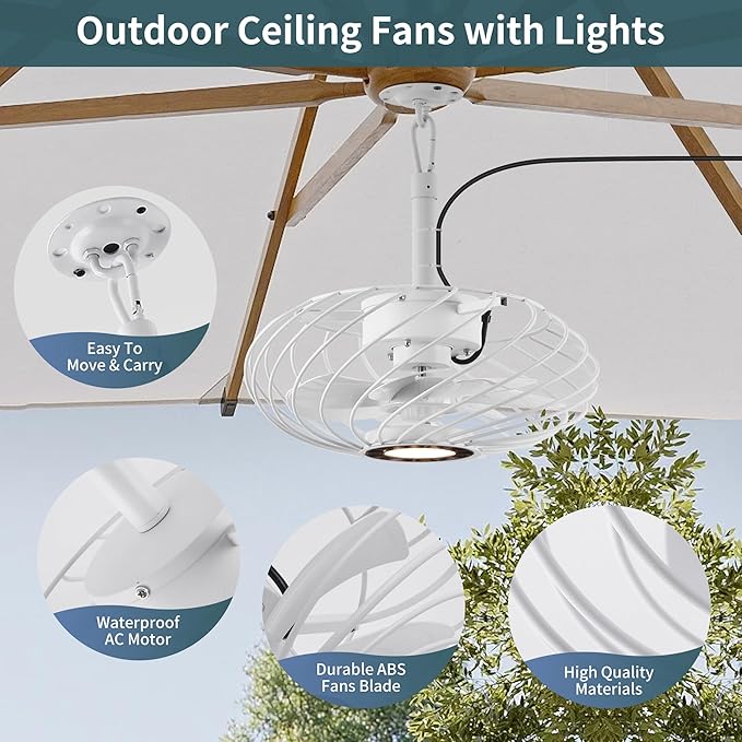 15" Outdoor Ceiling Fan with Light, Waterproof Gazebo Fan Remote Control, Dimmable LED Light, Hanging White Caged Ceiling Fixtures with Plug in Cord for Pergola