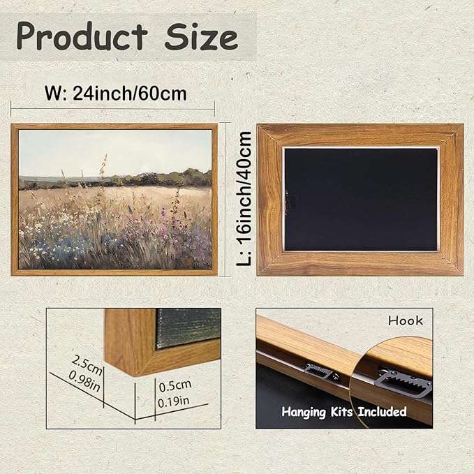 - 【Ready To Hang】Measuring 16x24Inch(40x60cm), this framed canvas art wall decor arrives ready to hang on the wall with hanging kits. (Before nailing the hook onto your wall, please refer to the installation instruction image provided. ) This vintage wildflowers meadow landscape art piece will bring a soothing effect to any room of your home with its calming colors. This antique landscape print is perfect for farmhouse style spaces with a bold elegance that makes it an iconic centerpiece for you.