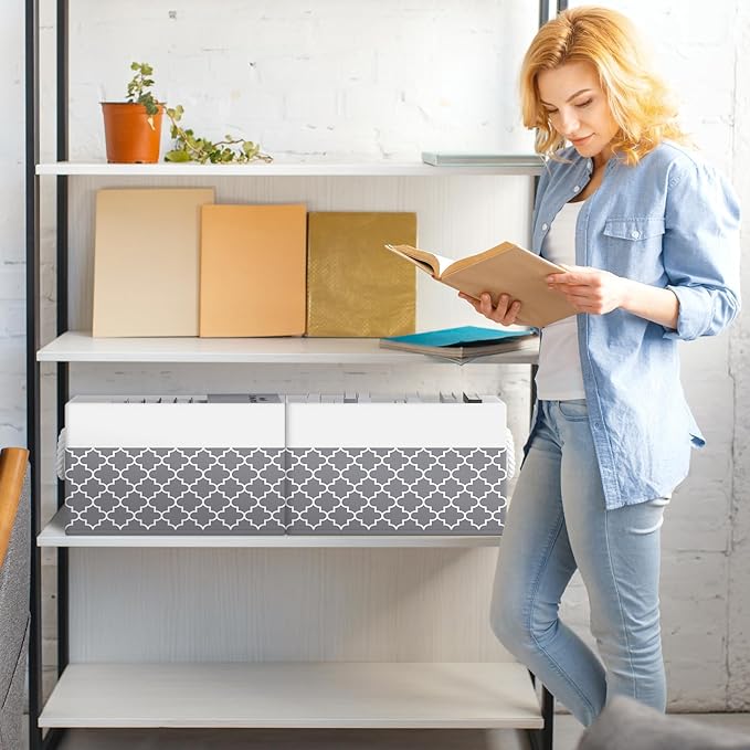 Fab totes Storage Bins [6-Pack], Foldable Storage Baskets for Organizing Toys, Books, Shelves, Closet, Large Storage Box with Rope Handles, Sturdy Organizer Bins,Clover Grey
