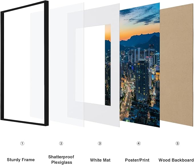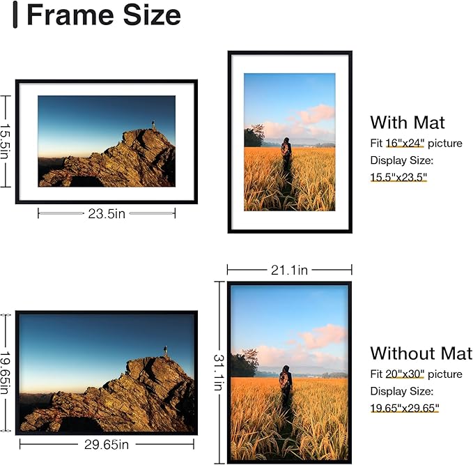 - Versatile Size Options: The frame set includes 3 removable white 16x24 inch mats for 16x24 posters and can fit 20x30 inch pictures without the mat, catering to different picture dimensions