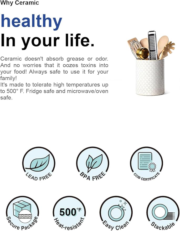 - Sturdy And Heavy: The high temperature fired ceramic utensil holder is sturdy in quality. You needn't worry about it will movement or tipping due to excess utensils. Smooth glaze on both inside and outside allow you with effortless to clean or dishwasher-safe, it makes your kitchen routine easier
