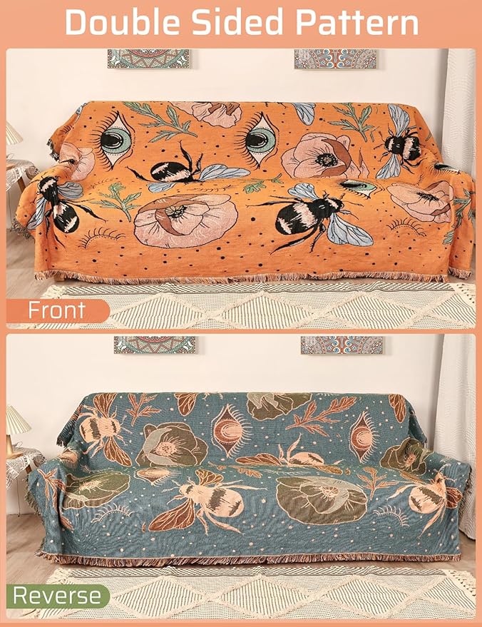 Boho Throw Blanket for Bed Couch Sofa Reversible Cotton Bohemian Travel Boho Quilt Mexican Muslin Blanket Tapestry Hippie Room Decor Outdoor Blanket Double Sided (Boho Bee Yelow 60"x80")