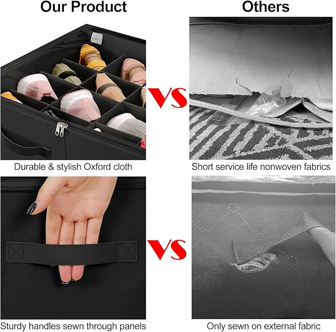 - Durable Materials & High-Quality: High quality Oxford fabric is more durable and stylish compared to non-woven fabrics. The reinforced side boards and inserted bottom ensure that shoe box can maintain its shape even under pulling or other pressure, and will not collapse when empty or full. The reinforced handles allow you to easily remove shoe bin from closet, shelves ect. With no handles on the back to avoid occupying space when placed against the cabinet wall