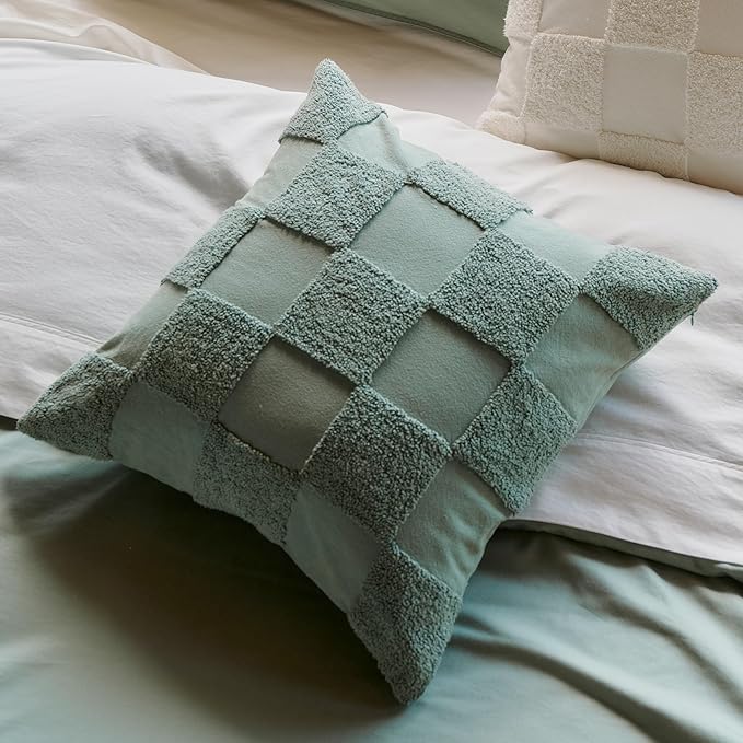 Double Stitch Checkered Throw Pillow Covers - 100% Cotton Tufted Boho Decorative Pillow Covers 20x20, Made in India, Square Cushion Case, Modern Home Decor for Couch, Sofa, Living Room, Chinois Green