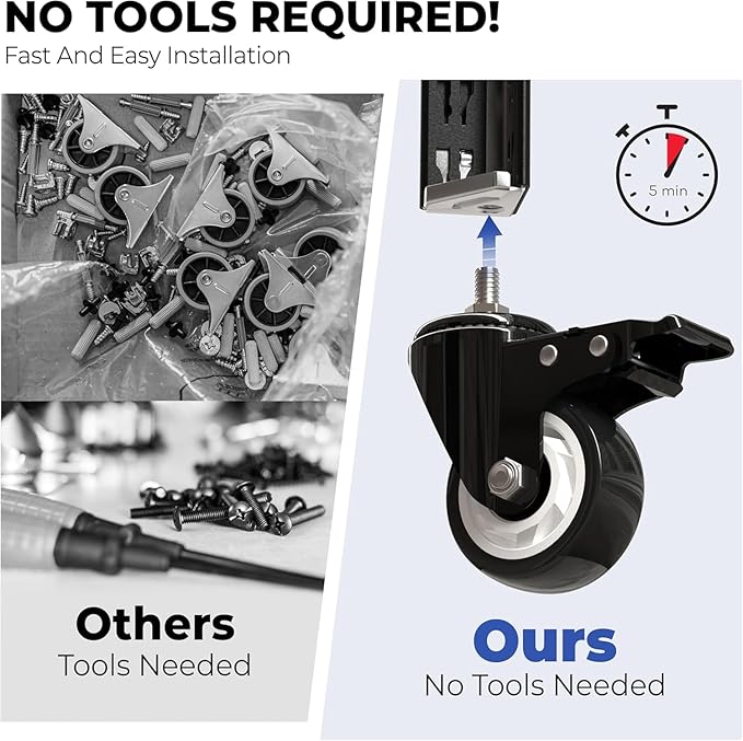 - Heavy Duty Premium Wheels : Experience versatility and effortless mobility, ideal for both indoor and outdoor use. These wheels are perfect for various applications, including trolleys, workbenches, furniture, and shelves, commonly found in workshops, garages, kitchens, and offices. The wear-resistant PVC wheels offer enhanced stability, making them suitable for heavy-duty usage and frequent daily activities. The total capacity of wheel shelves is 308lbs and the standing shelf is 881lbs