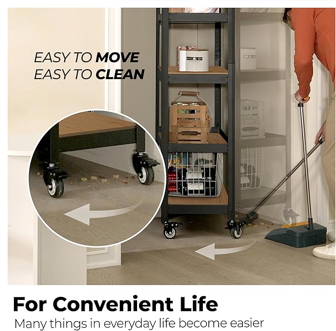 - Silent & Flexible Movement : This shelving offers a silent, easy-to-push experience. The swivel casters are designed to rotate 360 degrees, enabling effortless turning of the connected equipment. This feature is ideal for quietly and safely transporting light furniture and display items. Moreover, each caster is equipped with a reliable locking mechanism. This allows for convenient movement when desired and secure, stable positioning when needed, ensuring safety and peace of mind.