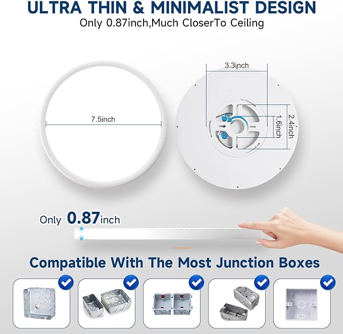 - 【Super Slim】The ultra-slim ceiling light fixture is designed with a modern and low-profile aesthetic, only 0.87 inch. Its minimal and integrated design ensures that the bulb always remains fashionable and blends seamlessly with various interior styles. This versatility allows you to use the fixture in a wide range of settings, including bedrooms, living rooms, kitchens, laundry rooms, closets, coatrooms, hallways, foyers, porches, corridors, balconies, stairwells, and offices.