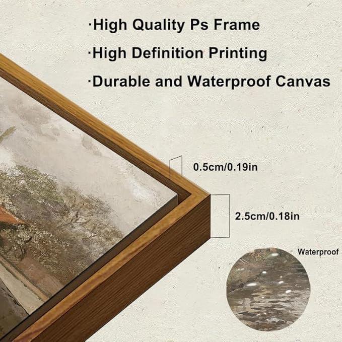 - 【Ready To Hang】Measuring 9x11Inch(23x28cm), this framed canvas art wall decor arrives ready to hang on the wall with hanging kits. (Before nailing the hook onto your wall, please refer to the installation instruction image provided. ) The vintage landscape decor is the best choice for Housewarming parties or gallery decoration.