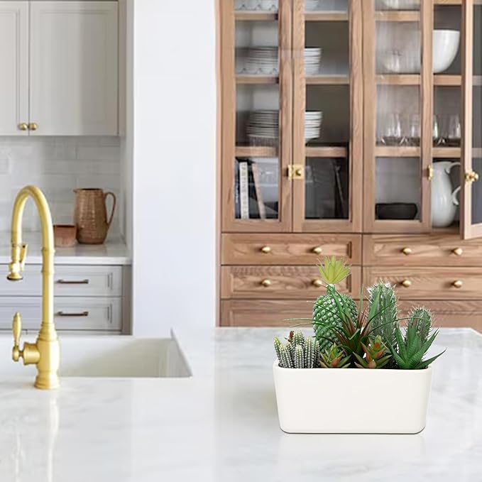 - Fake Plant in Ceramic Planter: Add a touch of elegance to your decor with these artificial succulents, beautifully arranged in a minimalist rectangular ceramic planter. The sleek, ceramic pot not only enhances the overall aesthetic with its clean lines and modern design but also provides durability. Measuring 5.9" x 3.5" x 7.4" (LxWxH), it's great for adding a touch of elegance to your home or office.